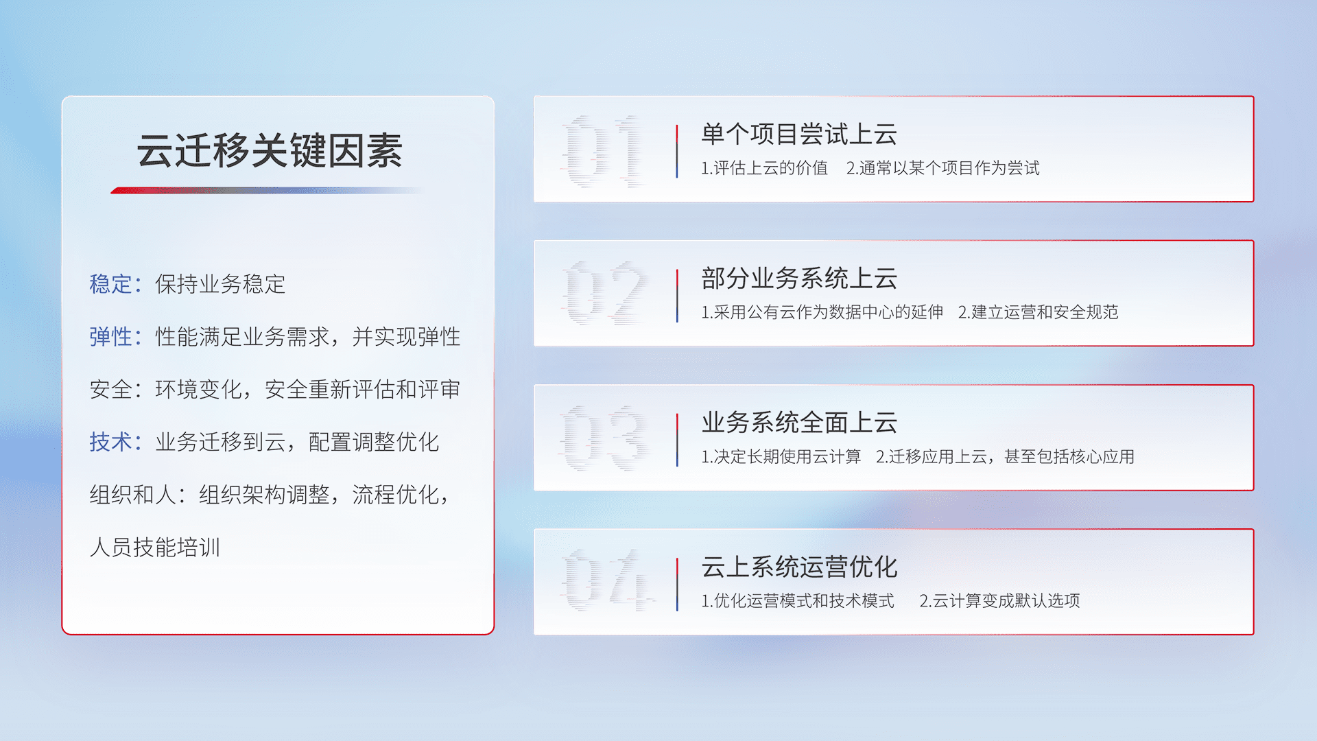 结合实际业务,,,,从规划设计、、云平台选型、、云原生改造、、、数据迁移、、集成交付,,,迁移全过程为客户识别最佳上云路径,,,做好风险识别管理,,,设计网络架构、、、、身份权限、、安全审计合规、、、操作审计、、日志审计、、监控告警策略、、、多站点容灾设计等,,,,对云上基础设施进行整体规划,,,提升IT治理水平,,,以满足弹性、、、高可用、、高性能的需求。。。。