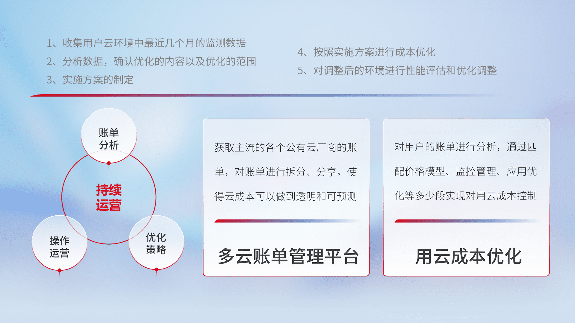 通过多云纳管,,,以统一的资源数据模型把客户的云资源进行抽象和封装,,,,进而实现对多云资源的统一操作,,,,保障云资源管理的可靠性、、稳定性与可用性。。量身定制化运维内容,,配置、、、、开发运维、、补丁管理、、备份、、、监控、、认证和访问管理、、、、审计和日常巡检等,,,,保障在用云过程中的可靠度,,,,稳定度以及高可用率。。。